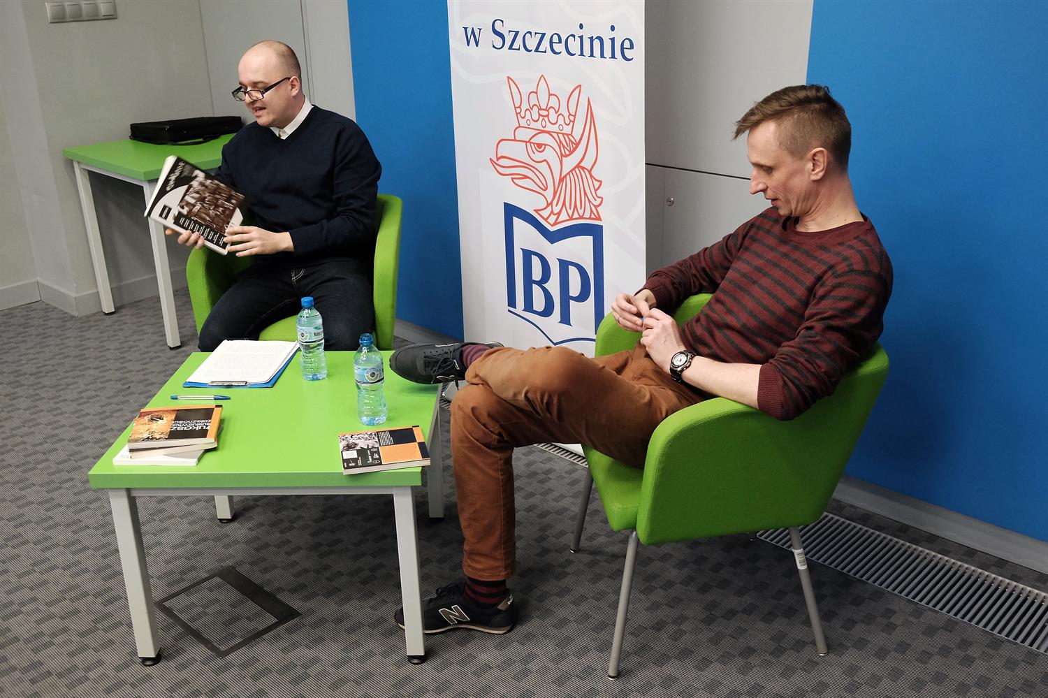 Łukasz Suskiewicz (z lewej) był specjalnym gościem podczas promocji najnowszego numeru kwartalnika literacko - artystycznego "eleWator" w salonie ProMedia w Szczecinie. Suskiewicz ma na koncie dwie książki opublikowane w szczecińskim wydawnictwie FORMA: "Egri bikaver" oraz "Zależności". Tematem wiodącym nowego "eleWatora" jest bieda. Spotkanie poprowadził Damian Romaniak.