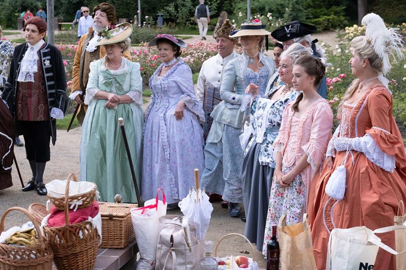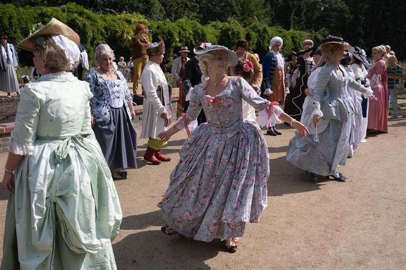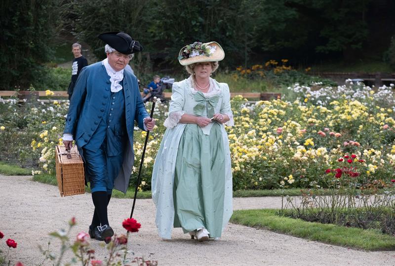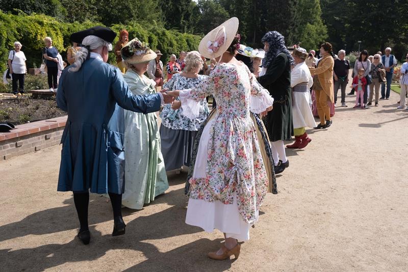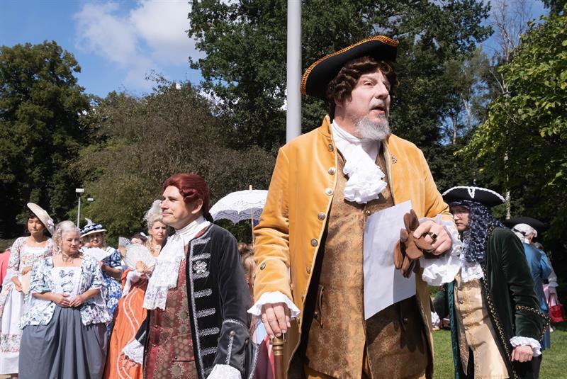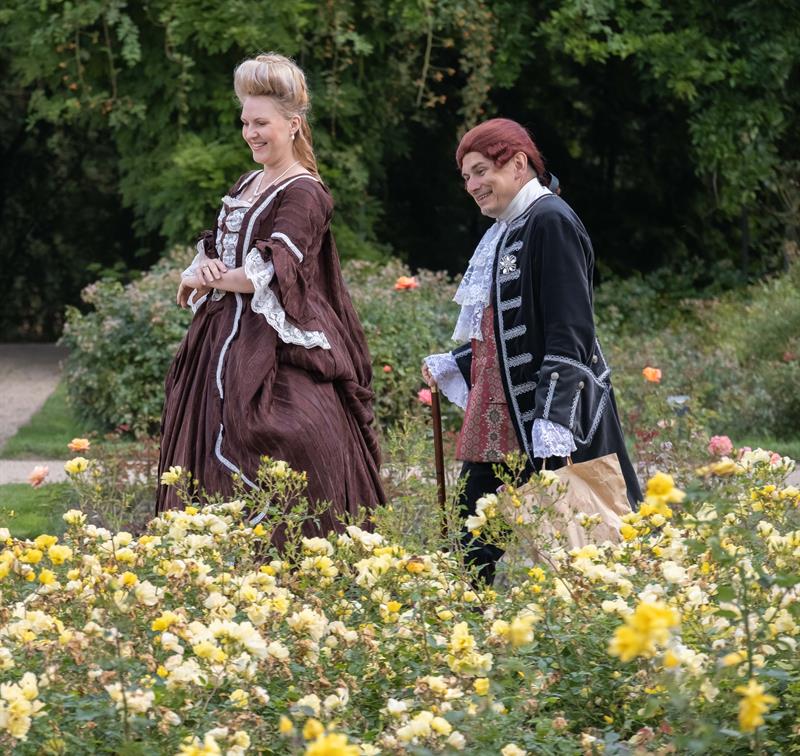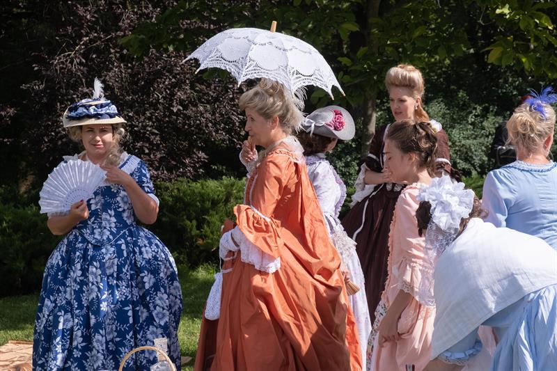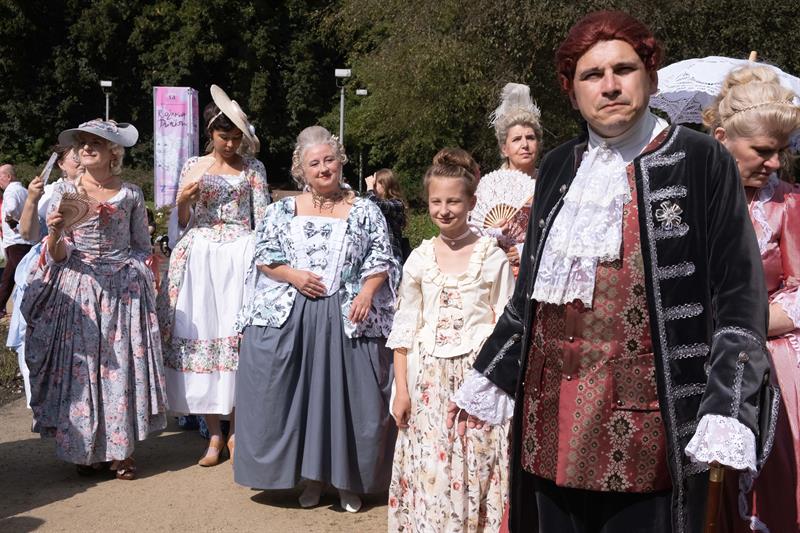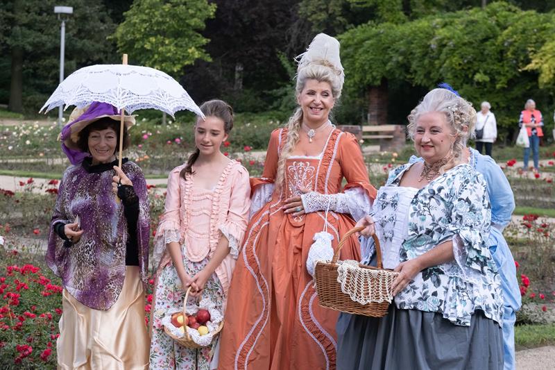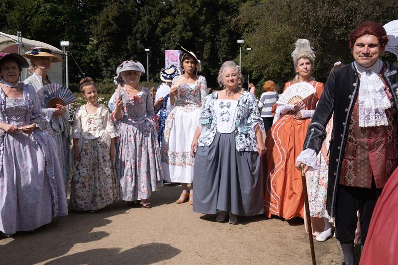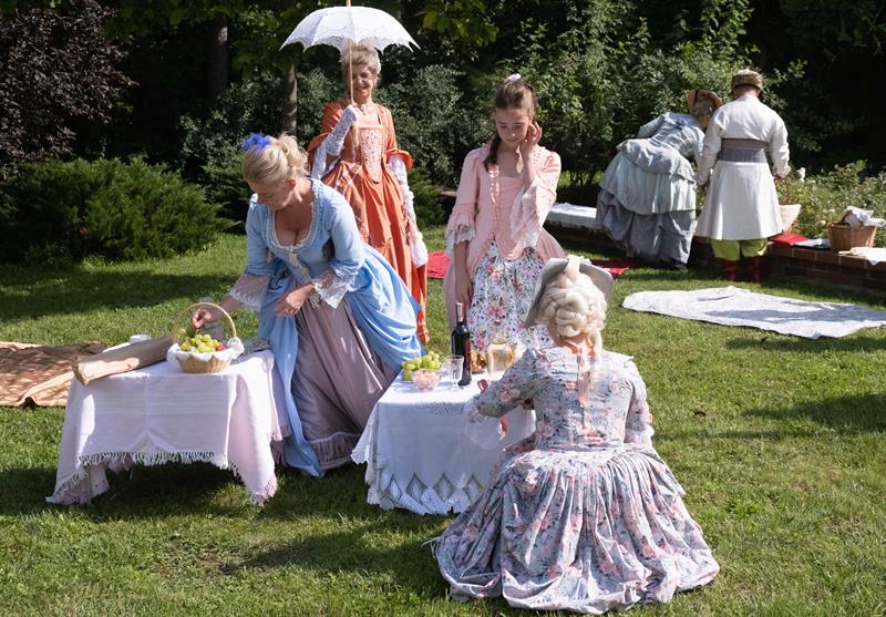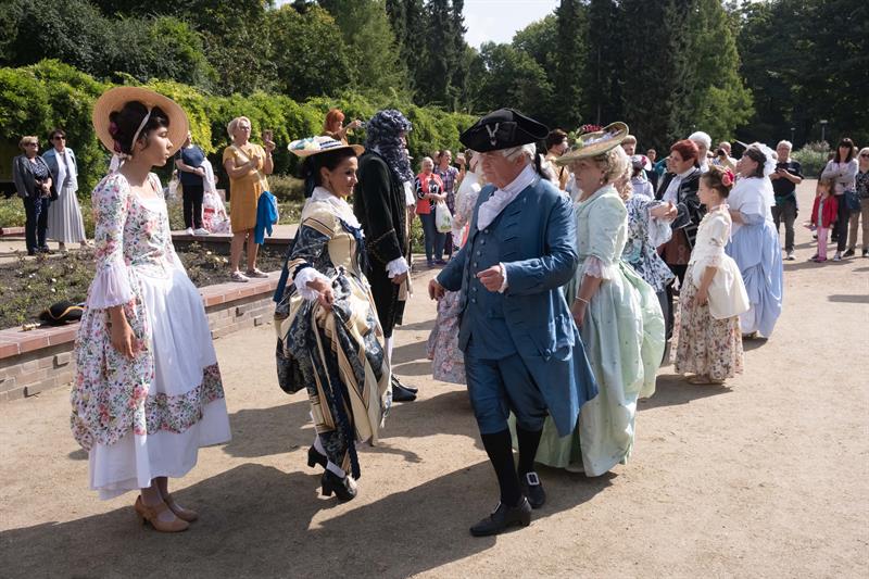 W alejkach spacerowych między rabatami przechadzały się panie w charakterystycznych dla tej epoki sukniach, gorsetach, z kapeluszami z tiulami i kokardami, czepcami, piórami w upiętych fryzurach. Z wachlarzami i parasolkami w dłoniach. A wraz z nimi panowie w żabotach, spodniach do kolan, rajtuzach, z perukami na głowach, w charakterystycznych filcowych kapeluszach i w pantoflach na obcasach. Ci z kolei dzierżąc zawadiacko zdobne laseczki do podpierania się zagajali rozmowy. A między nimi znalazł się też polski szlachcic w kontuszu.