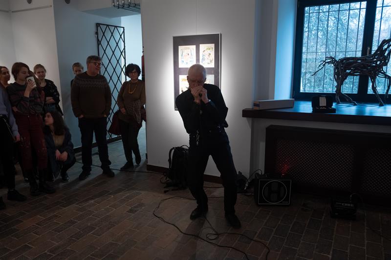 Atmosfera podczas piątkowego (23 listopada) wernisażu była naprawdę budująca. Uśmiechy na twarzach, serdeczne powitania i miłe, niewymuszone etykietą słowa. Warto podkreślić, że artysta zaprezentował się nie tylko jako plastyk, który ma własny, niepowtarzalny „ charakter pisma", ale także jako muzyk. W doborowym towarzystwie zagrał bowiem z wielką pasją na ustnej harmonijce bluesowo - jazzowe utwory, za których wykonanie zebrał, wspólnie z muzykującymi kolegami, zasłużone brawa.
