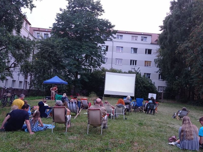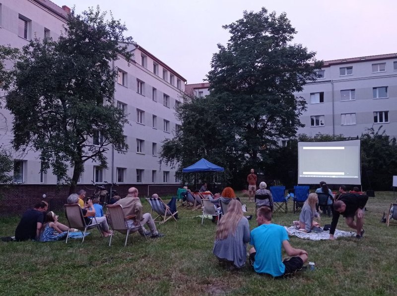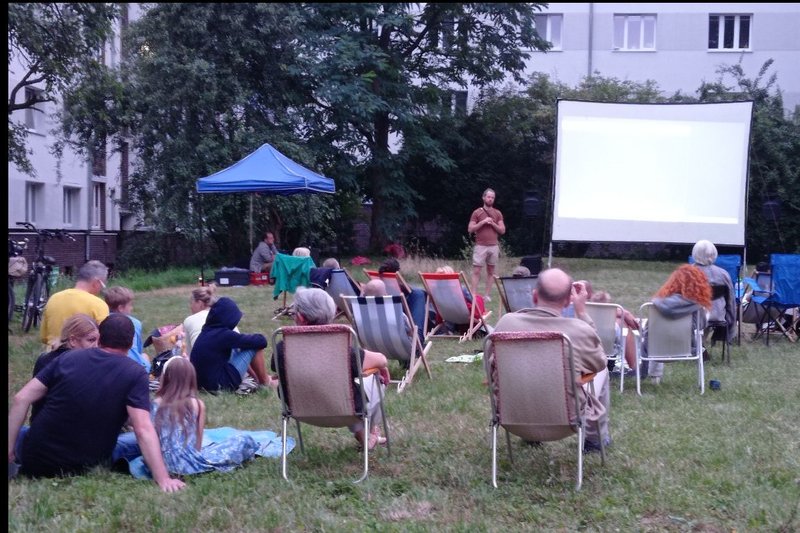 Do kina pod chmurką przyszło około trzydziestu osób. Tuż przed godziną 20, kiedy za chwilę miał się rozpocząć pokaz, na podwórku było zaledwie kilkanaście osób. Organizatorzy zdecydowali jednak, że nieco poczekają na spóźnialskich. I dobrze, bo zjawili się kolejni widzowie, którzy choćby wypatrzyli przez okno, że coś dzieje się na ich podwórku albo w trakcie spaceru z psem.