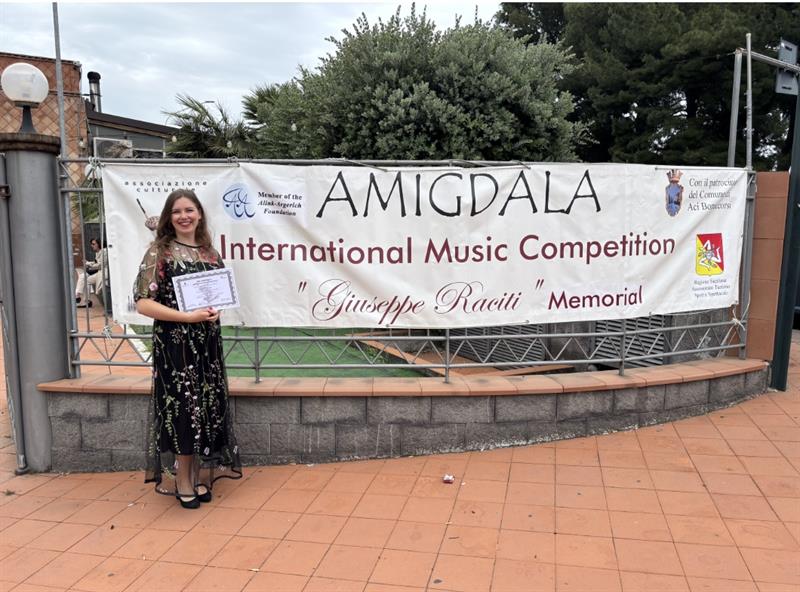 Natalia Lewandowska, studentka II roku studiów Akademii Sztuki na kierunku wokalistyka w klasie prof. dr hab. Katarzyny Dondalskiej, odniosła sukces na arenie międzynarodowej. Podczas XIV AMIGDALA International Music Competition w Aci Bonaccorsi/ Catania na Sycylii zdobyła pierwsze miejsce, prezentując zróżnicowany i wymagający repertuar. Konkurs odbył się w Teatrze „Leonardo Sciascia”, a wydarzeniu towarzyszyła wyjątkowa, międzynarodowa atmosfera. Natalia zachwyciła jury wykonaniem pieśni Antonína Dvořáka i Stanisława Moniuszki, a także wirtuozowskimi ariami: Adeli z operetki „Zemsta Nietoperza” oraz Marii z opery „Córka Pułku”. Przy fortepianie podczas przygotowań i samego konkursu towarzyszył jej niezastąpiony Michał Landowski.