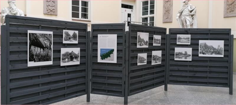 Na wystawie obejrzeć można archiwalne zdjęcia ze zbiorów Muzeum Narodowego w Szczecinie, na których utrwalone zostały przykłady przedwojennej zabudowy wiejskiej najbardziej charakterystycznej dla Pomorza Zachodniego: domy dolnosaskie, pyrzyckie oraz zagrody czworoboczne zamknięte. Na niektórych fotografiach, oprócz domów, można zobaczyć ich mieszkańców oraz elementy otaczającej ich codzienności: przydomowe ogródki, łodzie i sprzęt rybacki, suszące się pranie, różnego rodzaju przedmioty, takie jak koszyk, taczki, wózek. Wiejska architektura Ziem Odzyskanych, w tym Pomorza Zachodniego różni się od tej w pozostałej części Polski. Wieś podkarpacka czy podlaska to mieszanka dawnej architektury drewnianej i powojennej murowanej. Na Pomorzu Zachodnim czy Dolnym Śląsku przed 1945 rokiem budowano niemal wyłącznie domy murowane, zazwyczaj o elewacjach utrzymanych w duchu stylów historycznych – neobaroku i neorenesansu. Zdarzało się także budownictwo szachulcowe – o konstrukcji drewnianej wypełnionej cegłą lub gliną wymieszaną ze słomianą sieczką.