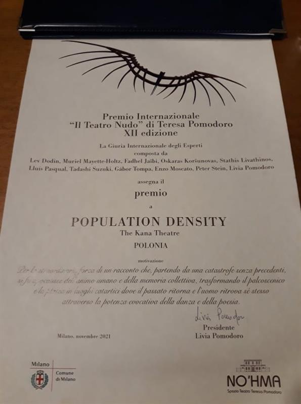Znakomita wiadomość z Mediolanu! Spektakl szczecińskiego Teatru Kana, zatytułowany "Gęstość zaludnienia. Historia wybuchu", zajął pierwsze miejsce w ramach XII edycji Międzynarodowej Nagrody "Teatr Nagi" im. Teresy Pomodoro. To ogromne wyróżnienie, które do tej pory nie trafiło w ręce polskich twórców. Tym większe, że w tym roku o pierwszą nagrodę starały się zespoły z m.in. Grecji, Hongkongu, Iranu, Kambodży, Włoch. Wyróżnienie z rąk prezydenta Mediolanu, podczas oficjalnej czwartkowej (4 listopada) gali wręczenia nagród, odebrali: Karolina Sabat, Dariusz Mikuła, Bibianna Chimiak, Piotr Starzyński oraz reżyser spektaklu - Krzysztof Popiołek.