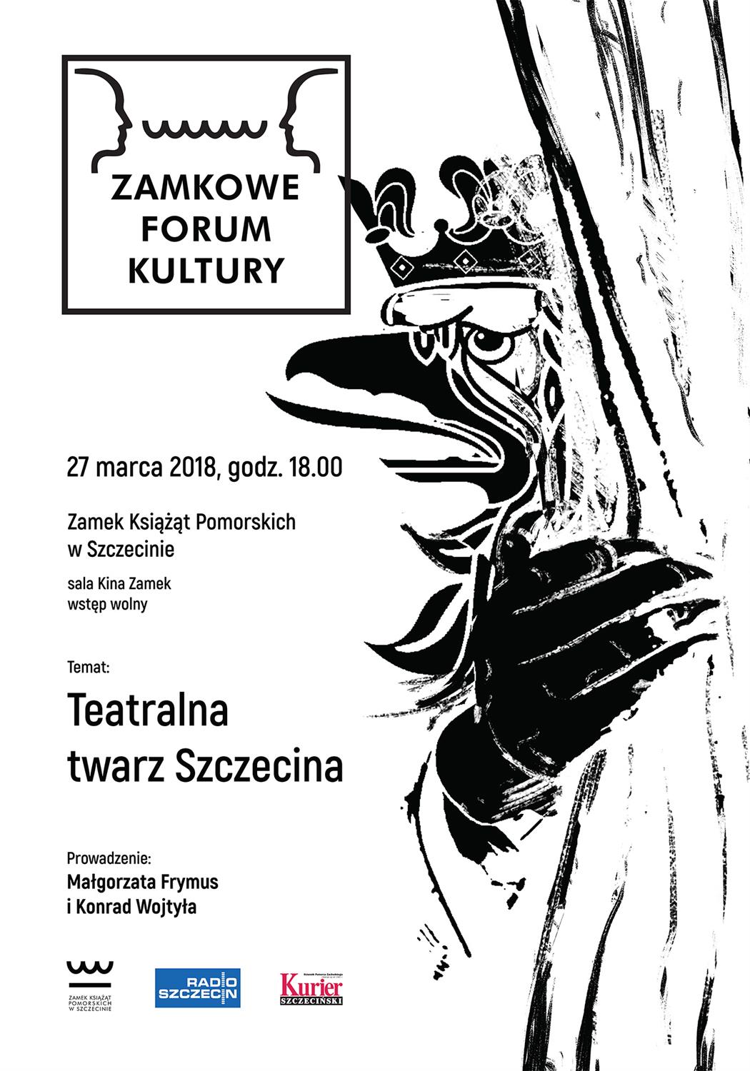 We wtorek (27 marca) o g. 18 w sali kina Zamek w Zamku Książąt Pomorskich w Szczecinie rozpocznie się dyskusja pod hasłem "Teatralna twarz Szczecina". Poprowadzą ją Małgorzata Frymus oraz Konrad Wojtyła. Dyskusja to kolejna odsłona cyklu Zamkowe Forum Kultury.