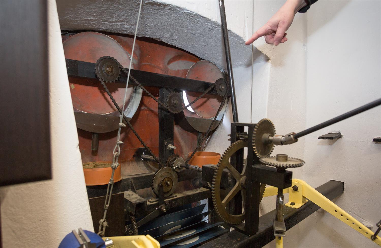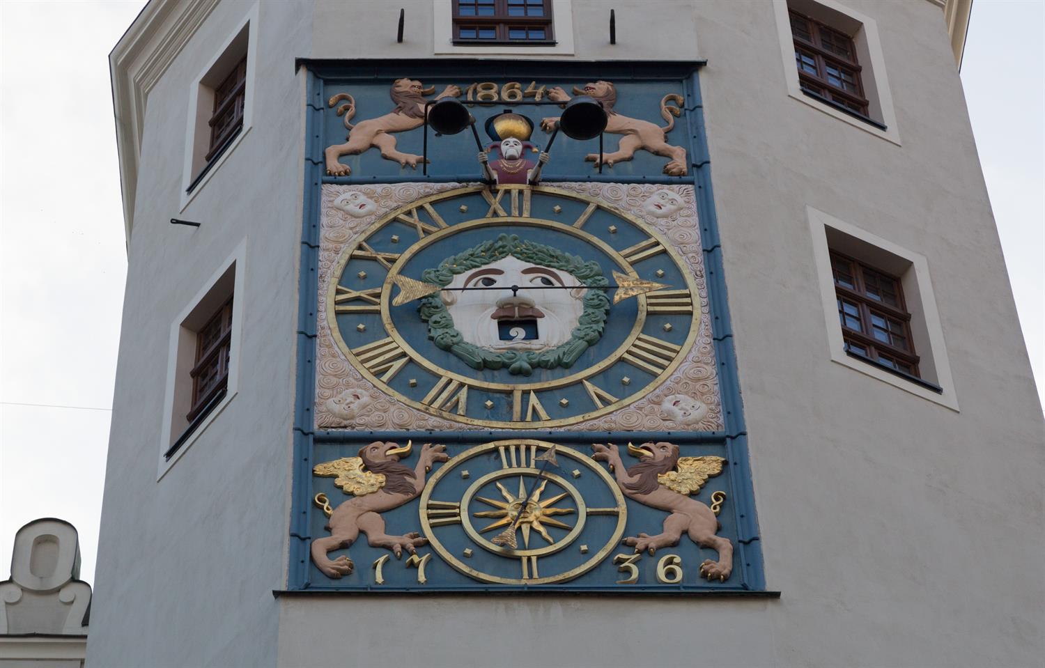 Zegar powstał w 1693 roku, natomiast widniejące na nim daty – 1736 i 1864 – pokazują lata, w jakich wykonano remont szczecińskiego czasomierza. Na samej górze z kolei są charakterystyczne lwy z okresu szwedzkiego, na tarczy na dole – gryfy pomorskie. Dość zagadkowa wydaje się na tarczy maska zielonego człowieka ze wskazówką na nosie (jego źrenice podążają za grotem dużej wskazówki). Jak mówi C. Złotnik, jest to symbol sił przyrody i znak templariuszy. ©℗