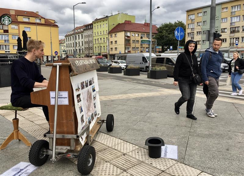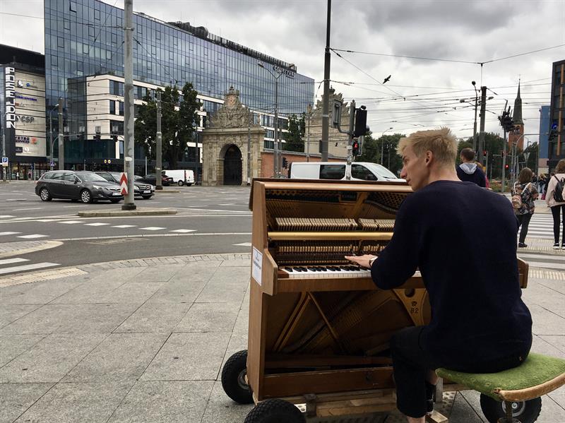 Miejskie brzdęki, czyli uliczne granie na pianinie na kółkach w wykonaniu Theloniousa Herrmanna, młodego muzyka z Kolonii. Stadtgeklimper, bo tak właśnie firmuje on swoje tournée po najróżniejszych zakątkach, w tym i miastach Europy. W minioną środę można było posłuchać jego koncertu przechodząc przez plac na Bramie Portowej. Artysta wzbudzał zaciekawienie przechodniów. Nie brakowało i takich, którzy wrzucili mu łaskawie co nieco do kapelusza. O jego wędrówce z instrumentem sporo można dowiedzieć się w mediach społecznościowych, a pomocny w niej jest mu specjalnie przystosowany ford transit, służący jednocześnie za dom. ©℗