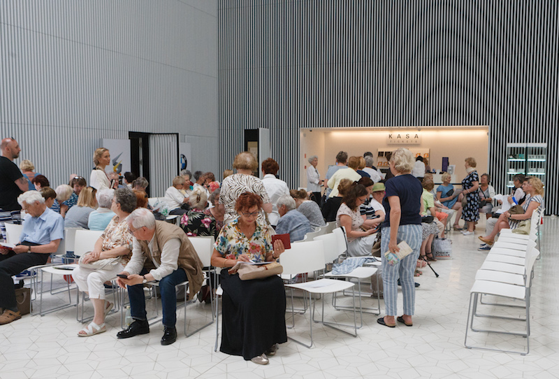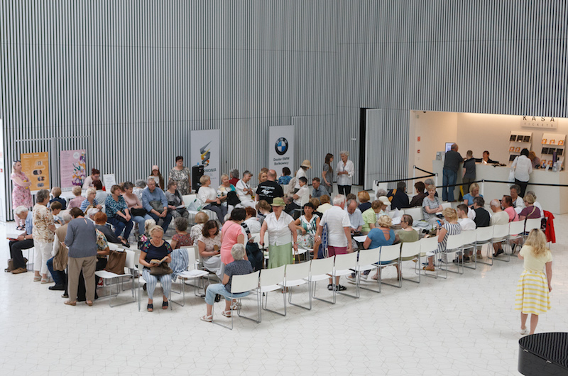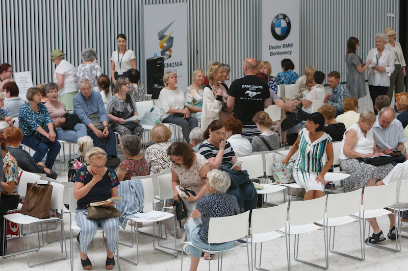 Po godzinie 9 drzwi do budynku zostały otwarte i już można było usiąść na jednym z prawie dwustu krzesełek w holu (tu kolejka jest bowiem „siedząca"). W oczekiwaniu na otwarcie kas, kolejkowiczom czas umilała muzyka na żywo. Otóż w holu ustawiono fortepian, na którym zagrał Krzysztof Baranowski - w tzw. trzech setach: o godz. 10, 11 i 12, otrzymując owacje na stojąco. Personel filharmonii zadbał też o coś dla ciała - dla melomanów przygotowano baniak z wodą do picia i ciasteczka.