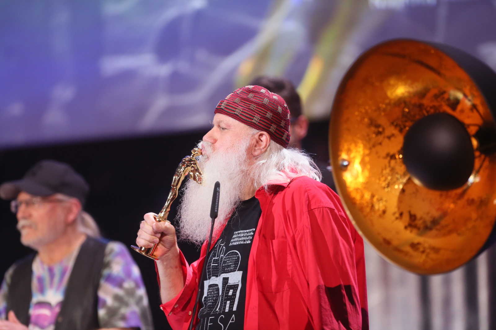 Na zdjęciu: Beno Otręba ze Złotym Fryderykiem dla grupy Dżem podczas gali 23. edycji Nagród Akademii Fonograficznej Fryderyki 2017