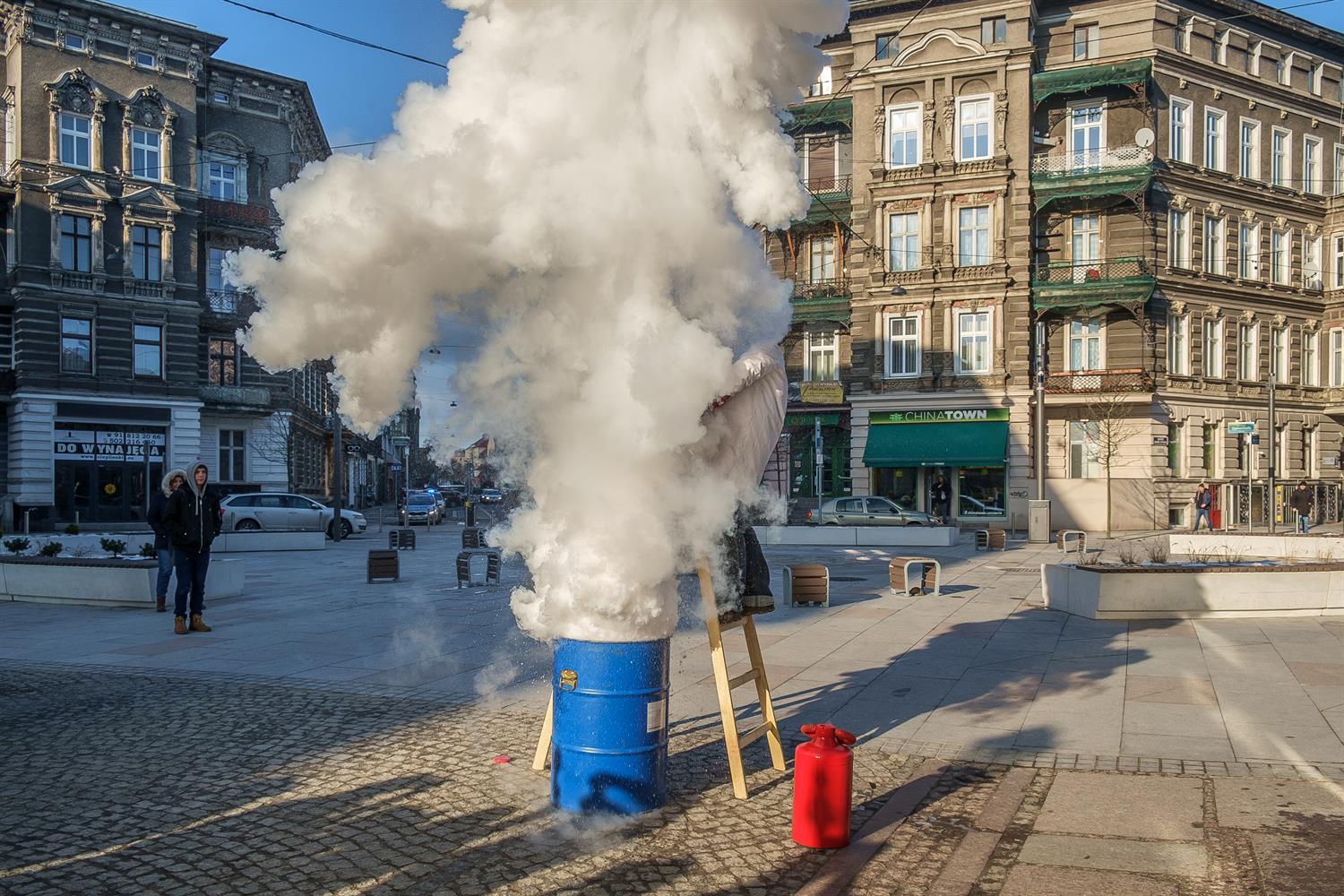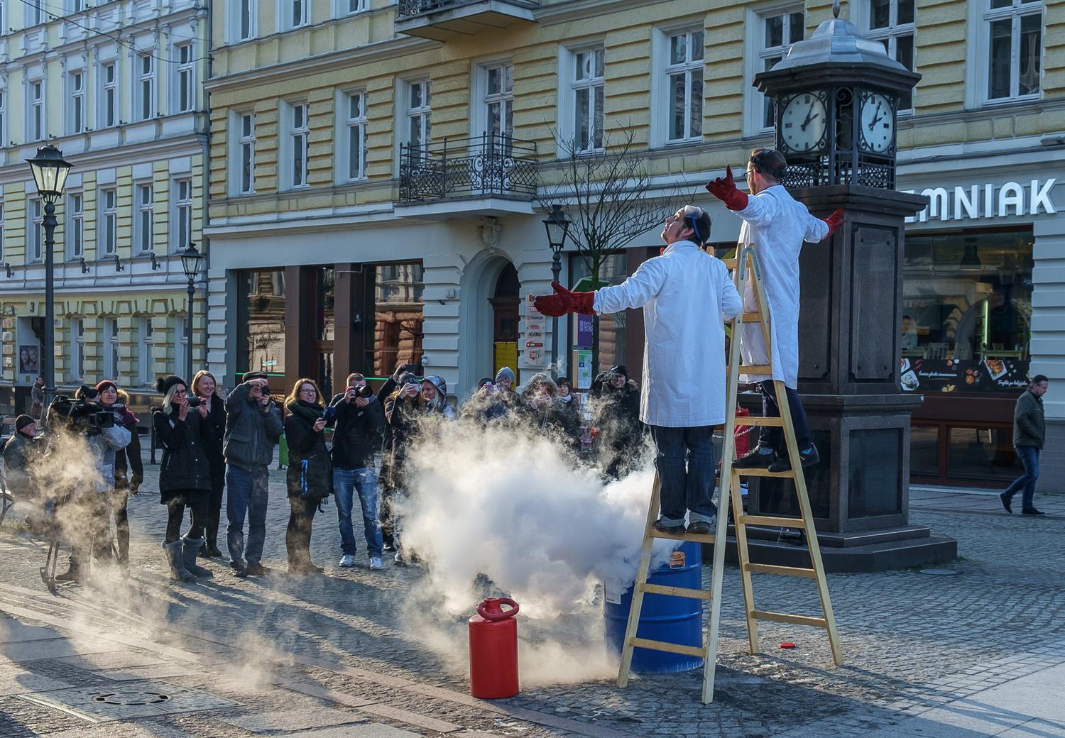 Na zdjęciu: Widowiskowy azotowy wybuch zademonstrowali w samym centrum Szczecina aktorzy i naukowcy - Paweł Królik i Stefan Królczyński.