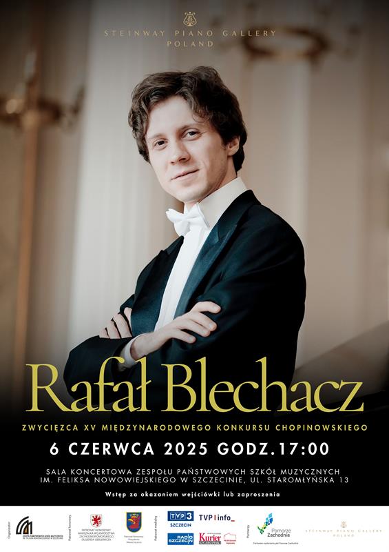Rafał Blechacz to jeden z najwybitniejszych polskich pianistów, występujący w najbardziej prestiżowych salach koncertowych, znany na całym świecie z wyjątkowej interpretacji dzieł Fryderyka Chopina. Słuchaczy zachwyca jego kunszt wykonawczy i głęboka wrażliwość. Melomani cenią jego wykonania utworów Chopina, a także Bacha, Beethovena czy Debussy’ego. Szczecińska publiczność usłyszy w interpretacji artysty romantyczne i klasyczne dzieła repertuaru fortepianowego. Koncert poza doznaniem artystycznym, ma niewątpliwie wymiar edukacyjny, stanie się inspiracją dla młodych muzyków, uczniów szkoły, a także okazją do niecodziennego spotkania z mistrzem.