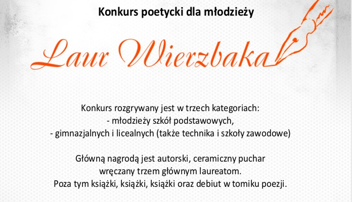 Ruszyła 32. edycja Ogólnopolskiego Konkursu Poetyckiego Młodzieży Szkolnej "O laur Wierzbaka". Młodzi poeci mogą wysyłać swoje wiersze do końca tego miesiąca na adres Ośrodek Kultury "Wierzbak", ul. Wojska Polskiego 8, 60-648 Poznań lub na adres mailowy - wierzbak@wierzbak.pl. Konkurs rozgrywany jest w trzech grupach - młodzieży szkół podstawowych, szkół gimnazjalnych oraz szkół licealnych. Nagrodą dla zwycięzców będzie publikacja ich wierszy w tomiku oraz udział w warsztatach poetyckich. Więcej informacji: wierzbak.pl.