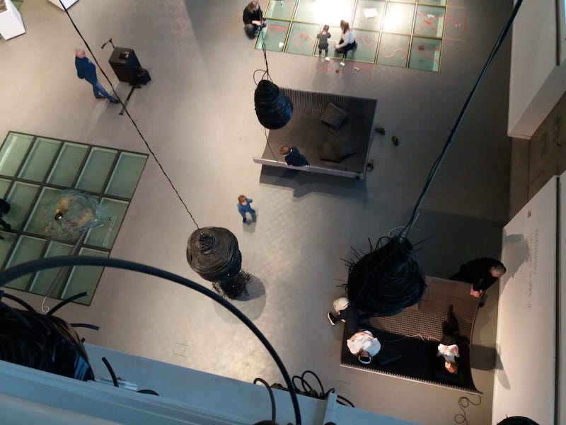 Na tej wystawie nie przeczytamy „Nie dotykać eksponatów”. Wręcz przeciwnie. Wszelka interakcja jest wskazana – można nie tylko patrzeć i słuchać, lecz także dotykać, a nawet wąchać. Nie znajdziemy tu też apelu o zachowanie ciszy, gdyż hałas może być inspiracją. Są „akustyczne ptasie gniazda” czy wydający dźwięki „dywan z potłuczonego szkła”.