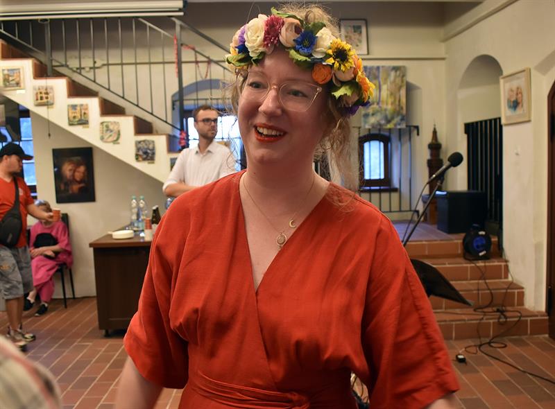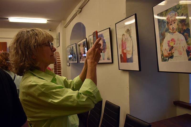 Artystka oprowadziła uczestników wernisażu po swojej wystawie, pokazując najpierw ziemniaka, którego namalowała mając 2,5 roku, poprzez akwarelowe portrety mamy w ciąży z nią, kończąc na portrecie z mężem, który namalowała na podstawie fotografii.
