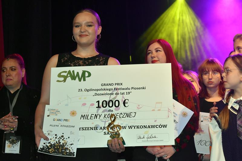 Najwyższe laury zdobyła Milena Konieczna z Nowogrodźca, woj. dolnośląskie, która otrzymała Grand Prix festiwalu. Dostała czek na tysiąc euro, ufundowany przez Stowarzyszenie Artystów Wykonawców SAWP.