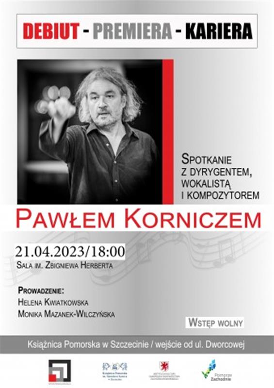 W piątek o g. 18 w sali im. Zbigniewa Herberta Książnicy Pomorskiej rozpoczyna się spotkanie z Pawłem Korniczem. Paweł Kornicz to dyrygent, wokalista i kompozytor. Absolwent szczecińskiej filii Akademii Muzycznej im. I.J. Paderewskiego w Poznaniu. Szef artystyczny „Deutsch Polnischer Chor HORYZONT” – niemiecko-polskiego chóru z Brüssow w Niemczech. Nauczyciel muzyki w SP nr 35 w Szczecinie, gdzie prowadzi chór szkolny.