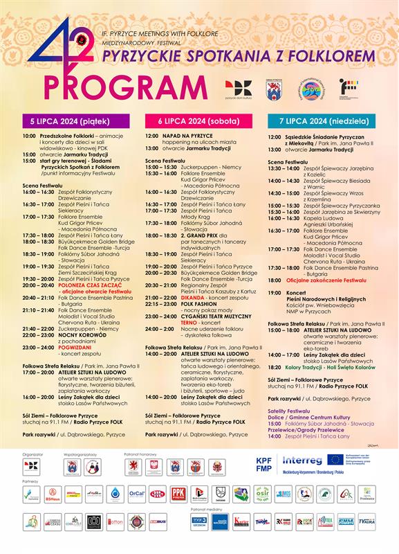 POLONEZA CZAS ZACZĄĆ - oficjalne otwarcie Festiwalu, a po nim: Folk Dance Ensemble Pastrina - Bułgaria, Folk Dance Ensemble Molodist i Vocal Studio Chervona Ruta - Ukraina, Zuckerpuppen - Niemcy, NOCNY KOROWÓD z pochodniami, POGWIZDANI - koncert zespołu. W sobotę o g. 12 NAPAD NA PYRZYCE - happening na ulicach miasta, a g. 13 otwarcie Jarmarku Tradycji. Zespoły na scenie zaprezentują się od g. 15 Zuckerpuppen - Niemcy; Folklore Ensemble Kud Grigor Prlicev - Macedonia Północna, Zespół Folklorystyczny Drzewiczanie, Zespół Pieśni i Tańca Łany, Zespół Pieśni i Tańca Młody Krąg, Folklórny Súbor Jahodná - Słowacja. W g. 18:00 – 18:30 GRAND PRIX dla par tanecznych i tancerzy indywidualnych, a potem: Zespół Pieśni i Tańca Siekieracy, Zespół Pieśni i Tańca Pyrzyce, Büyükçekmece Golden Bridge Folk Dance Ensemble - Turcja, Regionalny Zespół Pieśni i Tańca Kaszuby z Kartuz, DIKANDA - koncert zespołu. W g.