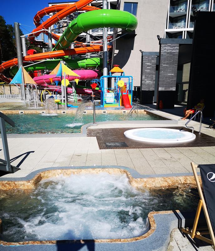 Kilka tygodni wcześniej zaczęła działalność część basenowa i SPA, która dostępna jest także dla gości z zewnątrz. Do dyspozycji mają część pod dachem i na powietrzu. Oprócz 25-metrowego basenu jest basen z boiskami do siatkówki, piłki wodnej i tor przeszkód. Jest rwąca rzeka, stanowiska do masażu ciała, rury do zjeżdżania, w tym także zapadnia wodna – dla ludzi o mocnych nerwach. Dla dzieci jest moc atrakcji – począwszy od statku pirackiego poprzez zjeżdżalnie i wodne safari.