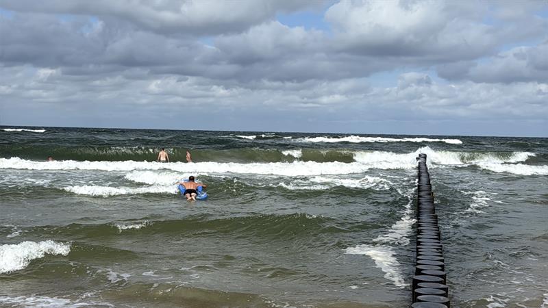 I tak oto mogliśmy w minioną sobotę zaobserwować kolejne ciekawe zjawisko. Na kąpielisku powiewa czerwona flaga. Na plaży strzeżonej przez ratowników nie ma w wodzie nikogo. A tuż obok, niemal przy granicy "wyznaczonej" ostrogami, przy wysokich falach, radośnie bawią się plażowicze. Mają koła, materace... Fale są wysokie, przykrywają śmiałków. Im wyższa fala, tym większa radość. Dużo śmiechu. Patrzymy, jak ratownik pochodzi do niestrzeżonego terenu i próbuje wpłynąć na zachowanie pływającego na materacu. Na gwizdek mężczyzna zareagował. Spojrzał, pomachał ręką (może machnął po prostu) i popłynął w głąb morza.