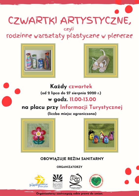 „Czwartki artystyczne, czyli rodzinne warsztaty plastyczne w plenerze”, trwać będą od 2 lipca do 27 sierpnia w godz. 11-13 na placu przy Informacji Turystycznej. Podczas spotkań liczba miejsc będzie ograniczona, a warsztaty odbywać się będą z zachowaniem reżimu sanitarnego.