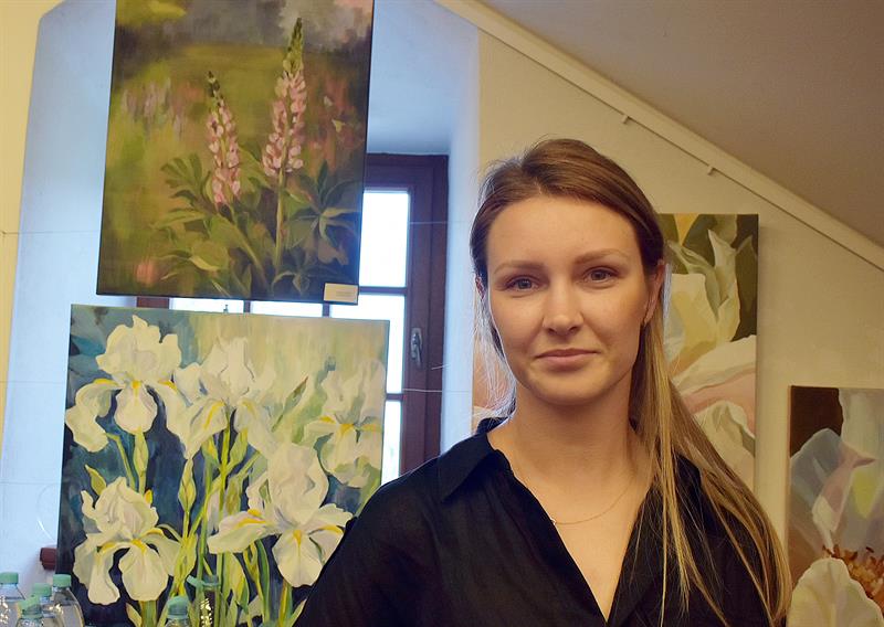 – Moje obrazy przedstawiają kwiaty – mówi artystka Aleksandra Słoniewska, uczestniczka pleneru już po raz drugi, na co dzień pracująca w żłobku Elemelek. – Myślę, że to jest wdzięczny temat. Zresztą ja bardzo lubię kwiaty, dlatego je uwieczniam.