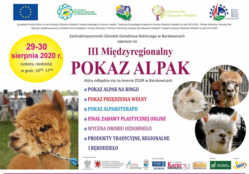 Na terenie Zachodniopomorskiego Ośrodka Doradztwa Rolniczego w Barzkowicach w dniach 29-30 sierpnia 2020 r. (sobota i niedziela, godz. 10-17) odbędzie się III Międzyregionalny Pokaz Alpak. Prezentacja polecana jest wszystkim sympatykom alpak, właścicielom gospodarstw agroturystycznych i zagród edukacyjnych chcącym poszerzyć swoją ofertę turystyczną. Pokaz skierowany jest również do obecnych oraz przyszłych, potencjalnych hodowców.