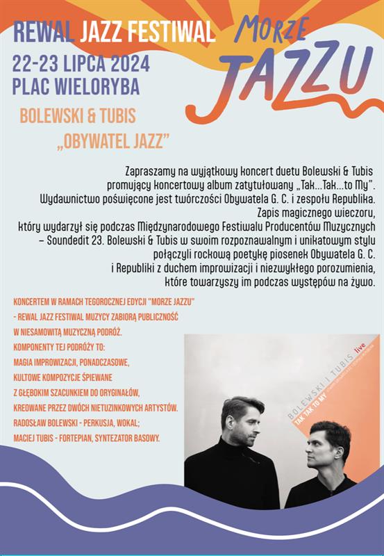 W poniedziałek Michał Barański zagrał w czterech różnorodnych gatunkowo stylistykach z MaBaSo Trio, z Kuba Więcek Trio z Shacharem Elnatanem oraz z Agą Zaryan. Duet Bolewski & Tubis natomiast dziś, we wtorek (23.07.), zaga koncert poświęcony twórczości Obywatela G. C. i zespołu Republika.