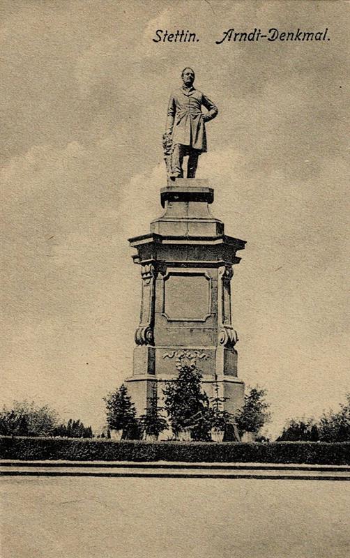 W ramach upamiętnienia jego postaci w Szczecinie zagospodarowano teren, ustawiono ławeczki oraz posadzono kwiaty i drzewa. Postawiono też pomnik Arndta i fontannę. Pomnik został rozebrany w 1933 roku – ponieważ wykonany był z nietrwałych materiałów i zaczął się po prostu kruszyć, stwarzając zagrożenie. Przy okazji warto podkreślić, że szczeciński pomnik był dość luźną kopią pomnika z 1865 roku postawionego w Bonn. Szczeciński Arndt, co widać na starych pocztówkach, opiera się prawą ręką o pień ściętego drzewa, lewą podpiera bok i wpatruje się w dal. Arndt w Bonn podpiera się o drzewo lewą ręką, prawą zaś wyciąga przed siebie.