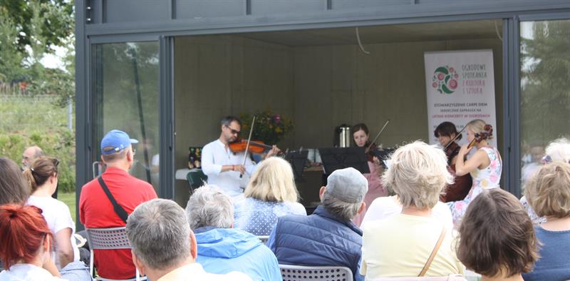 Tym razem w malowniczym otoczeniu rozbrzmiewała muzyka świata, dzieła kompozytorów z różnych krajów, znane, lubiane i grane… nie do znudzenia. Obok „Fal Dunaju”, „Jalousie”, „Pod niebem Paryża”, walca z filmu „Noce i dnie” z przyjemnością wysłuchaliśmy także koreańskiego utworu. Ale też jak doskonałe było ich wykonanie! Grał kwartet smyczkowy BA-ROCK – muzycy naszej Opery na Zamku: Misza Tsebriy (pierwsze skrzypce), Olga Kharitonova (drugie. skrzypce), Natalia Lebedeva (altówka) i wykładowczyni Akademii Sztuki Katarzyna Kupny (wiolonczela). Dodajmy do tego krótkie zapowiedzi z dowcipnymi dykteryjkami prowadzącego koncert Dariusza Koronczewskiego i półtorej godziny minęło nie wiadomo kiedy. I słuchać się wciąż chciało. Iza Dryjańska, szefowa Carpe diem i pomysłodawczyni tych imprez, zaprasza już na kolejną – 27 sierpnia do Wołczkowa na ul. Babiego Lata 5, a jest to nie tak daleko od przystanku. Ostatni z tego cyklu koncert odbędzie się 17 września w Dołujach przy ul. Gronostajowej 15, o czym jeszcze przypomnimy. Niedzielna impreza ogrodowa dofinansowana została z budżetu Województwa Zachodniopomorskiego, programu Społecznik 2022-24. ©℗