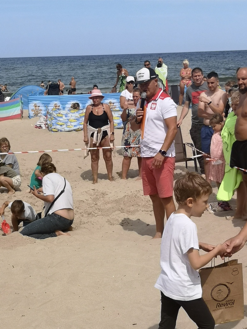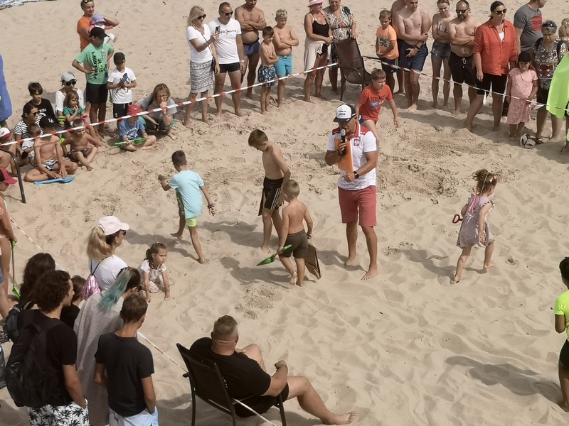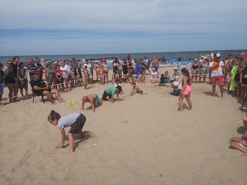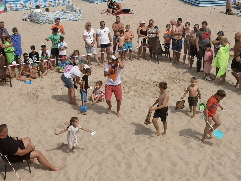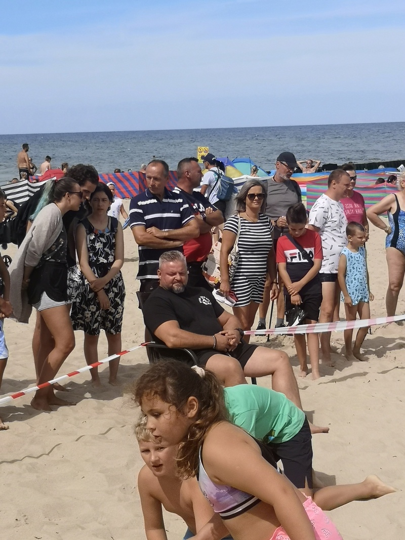 Jak się okazało zadanie nie było łatwe, bo chociaż dzieci widziały miejsca gdzie były zakopywane karteczki, to miały spory problem z ich odnalezieniem. Zabawę prowadził Irek Bieleninik, któremu pomagał Sławomir Toczek znany polski strongmen, który dzień prezentował swoje umiejętności na ulicach Pobierowa.