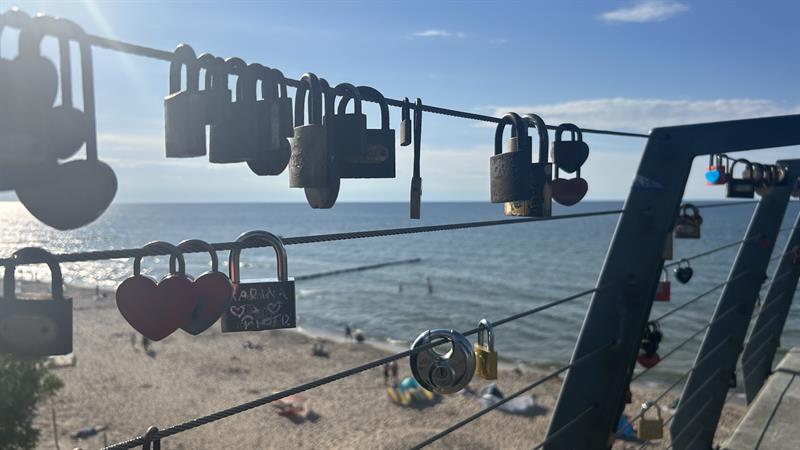 Morze z perspektywy tarasu widokowego w Rewalu. Na pierwszym planie kłódki, symbole wierności, które zawieszają zakochani turyści. Dla jednych to piękny symbol i element romantycznej celebry, dla drugich destrukcyjne obciążenie konstrukcji poręczy, w wyniku której pękają linki zabezpieczające.