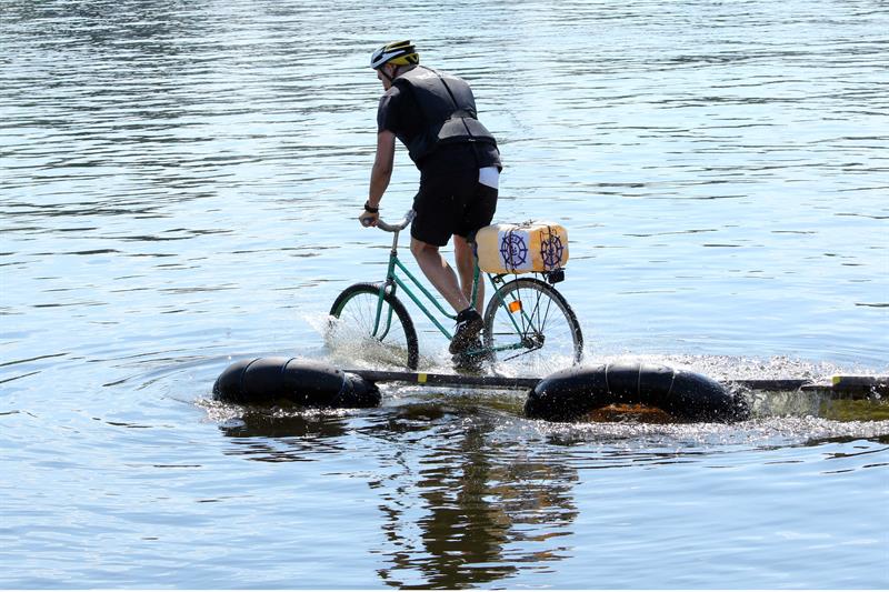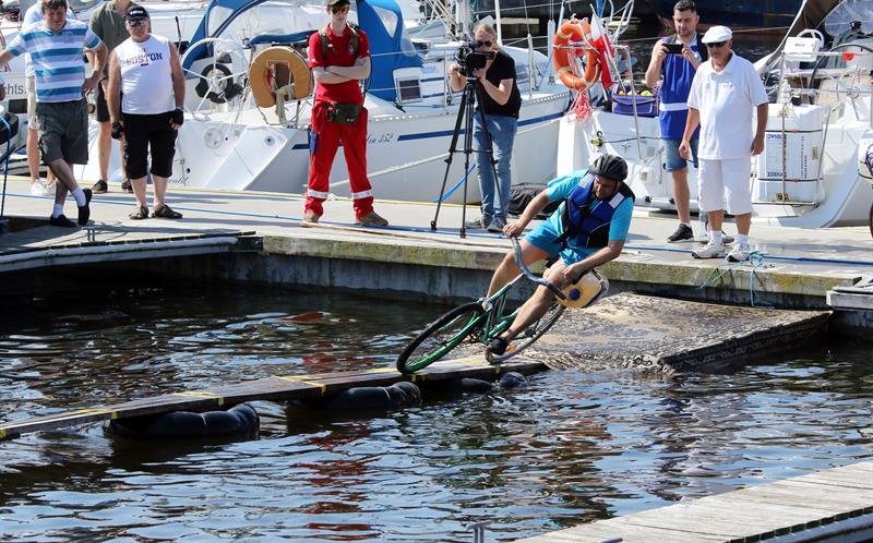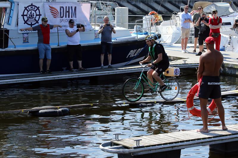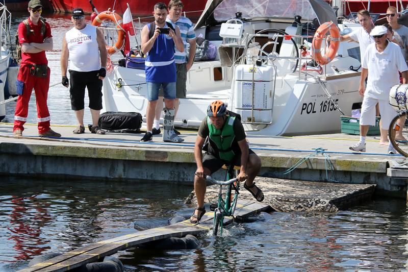 W kołobrzeskim porcie jachtowym odbyły się tradycyjne zawody w jeździe rowerem po desce na wodzie. Mowa o zmaganiach śmiałków, których zadaniem było przejechanie po 20-metrowej długości desce wspartej na pływających dętkach.