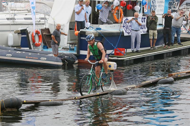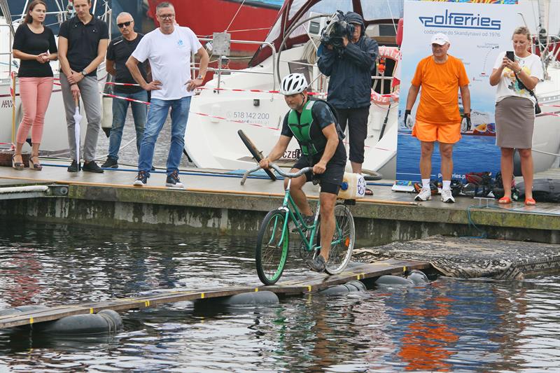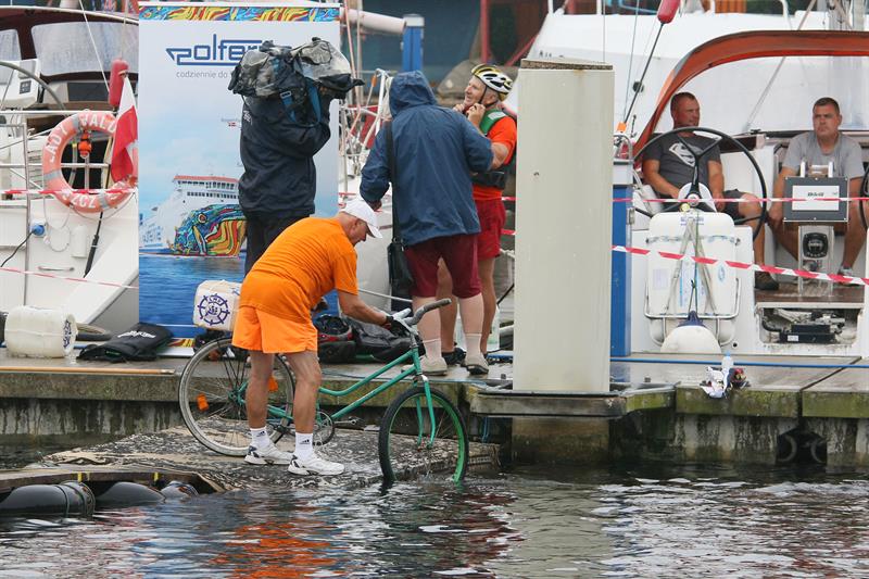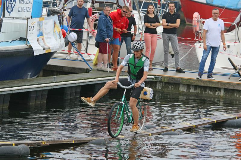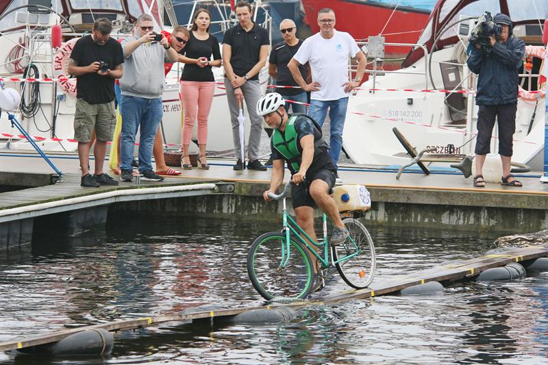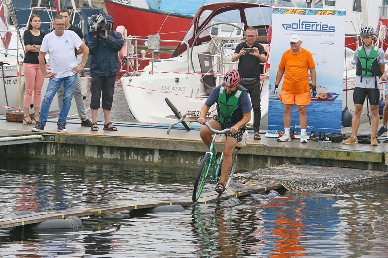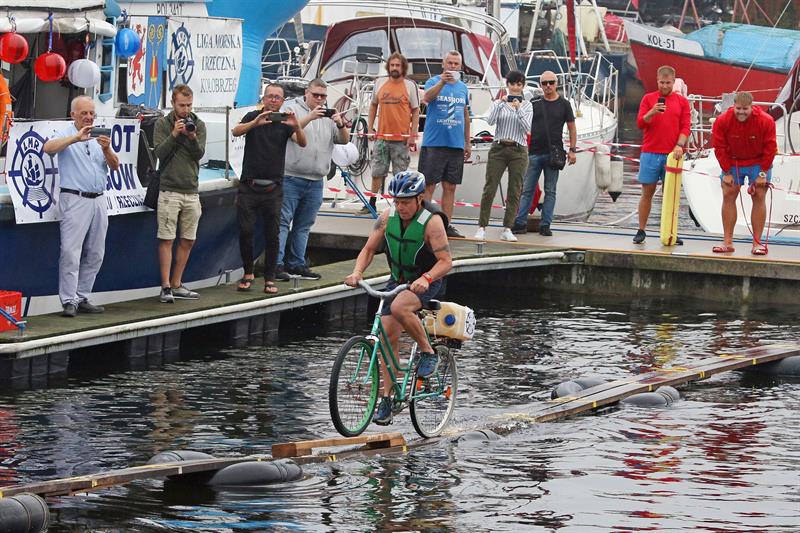 Jeden za drugim zawodnicy wpadali do wody. Mowa o zorganizowanych w Kołobrzegu po raz 23 zawodach w jeździe rowerem po desce pływającej na wodzie. Impreza, która odbyła się w sobotę w porcie jachtowym, przygotowana została przez działaczy Ligi Morskiej i Rzecznej. Na starcie 21-metrowej trasy pojawiło się 37 śmiałków, zarówno miejscowych, jak i odwiedzających kurort okazjonalnie. Był też jeden obcokrajowiec – Anglik Carl Mottramto (na zdjęciu), mieszkający w Kołobrzegu. To właśnie on wygrał tegoroczną edycję zawodów, pokonując dwukrotnie – bo także w finale – całą trasę. ©℗