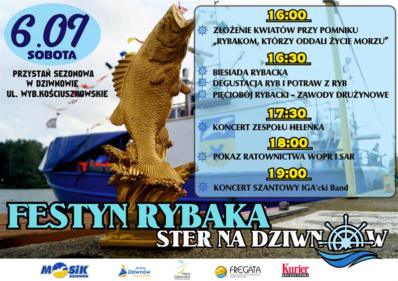 W Dziwnowie smakowitych potraw można będzie spróbować w sobotę. Od g. 16 trwać będzie Festyn Rybaka „Ster na Dziwnów” na terenie Przystani Sezonowej w Dziwnowie (ul. Wybrzeże Kościuszkowskie 2a). W programie: Złożenie kwiatów przy pomniku „Rybakom, którzy oddali życie na morzu”, Biesiada Rybacka, czyli degustacja ryb i potraw z ryb; Pięciobój Rybacki – zawody drużynowe; Koncert zespołu „Helenka”; Pokaz ratownictwa WOPR/SAR Dziwnów; Koncert szantowy w wykonaniu IGA’cki Band.