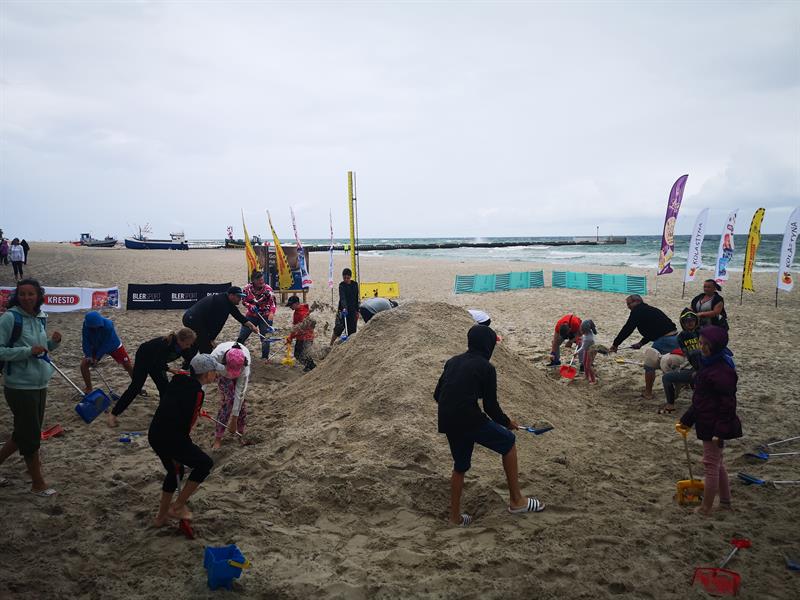 Rekordowy kopiec usypano w ubiegłym roku. Miał wysokość 352 cm, a pomiaru dokonuje się za pomocą mierników laserowych. Sypać może każdy, ale wykorzystując do tego celu łopatki dostarczone przez organizatorów. Niestety, wiatr i deszcz nieco pokrzyżowały plany i na plaży w Niechorzu pojawiło się mało chętnych. Może na kolejnych zawodach będzie inaczej.