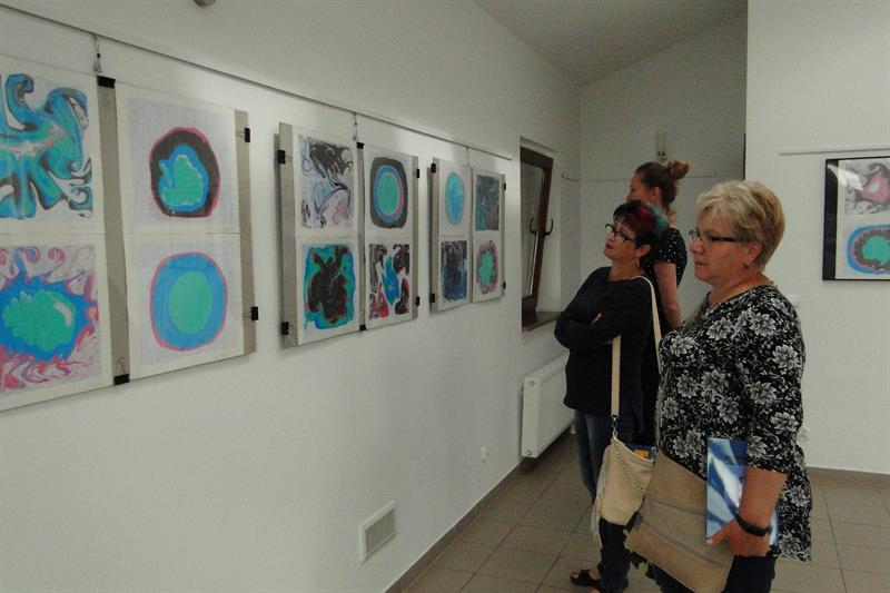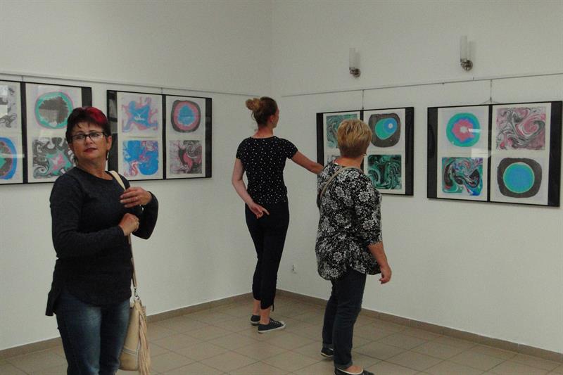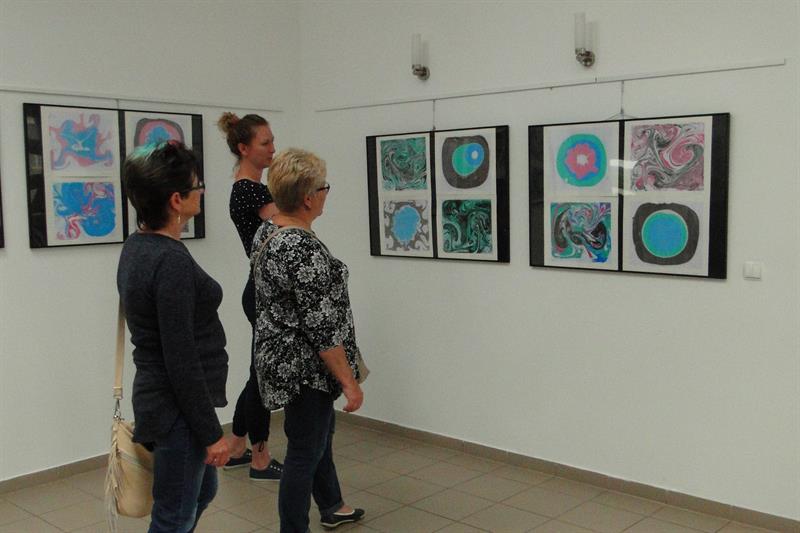 Technika „marmurkowania”, w jakiej wykonano wyeksponowane prace, polega na zdobieniu papieru poprzez przenoszenie nań wzorów tworzonych za pomocą farb rozprowadzanych pędzelkami i patyczkami na wodzie zagęszczonej tłustą substancją. – O, jaki piękny wzór na szal ozdobny albo zwiewną letnią suknię – zachwycały się panie zwiedzające wystawę.