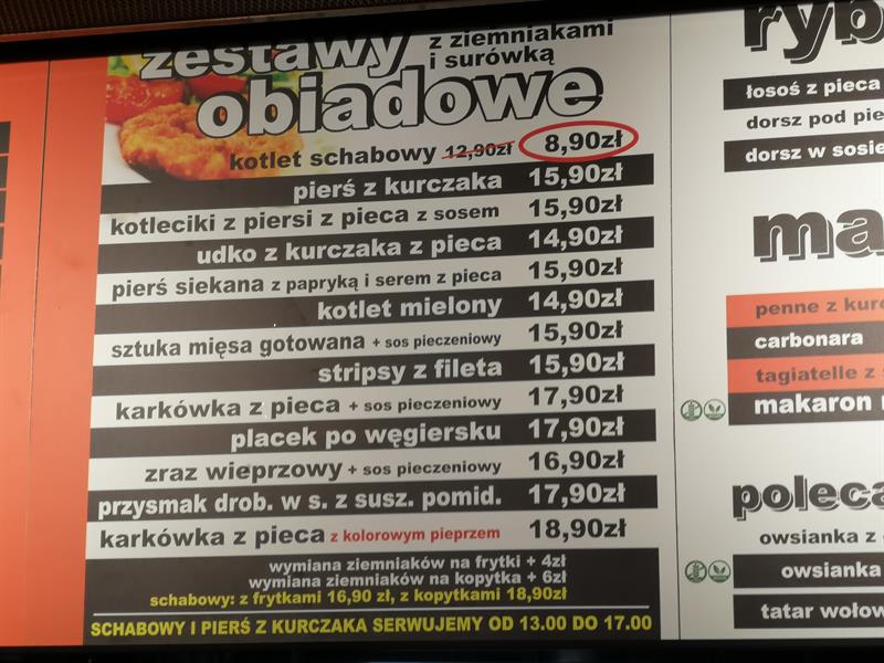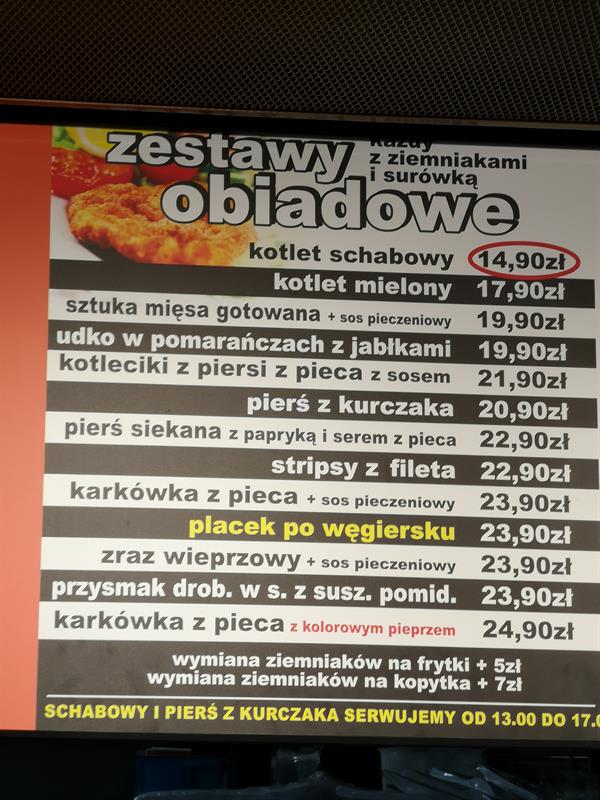 Niskie ceny w tym lokalu powodują, że zawsze stoi tu kolejka zgłodniałych klientów, którzy chwalą nie tylko ceny, ale także smak serwowanych potraw. Polecamy, gdyż jest to lokal wart pochwały, którego właściciele podają w miarę tanie dania, ale mają pełno klientów, którzy wolą poczekać, nie przepłacić i dobrze zjeść. Zadowolone są zatem obie strony. Tu na paragony grozy nikt się nie poskarży. ©℗