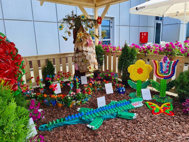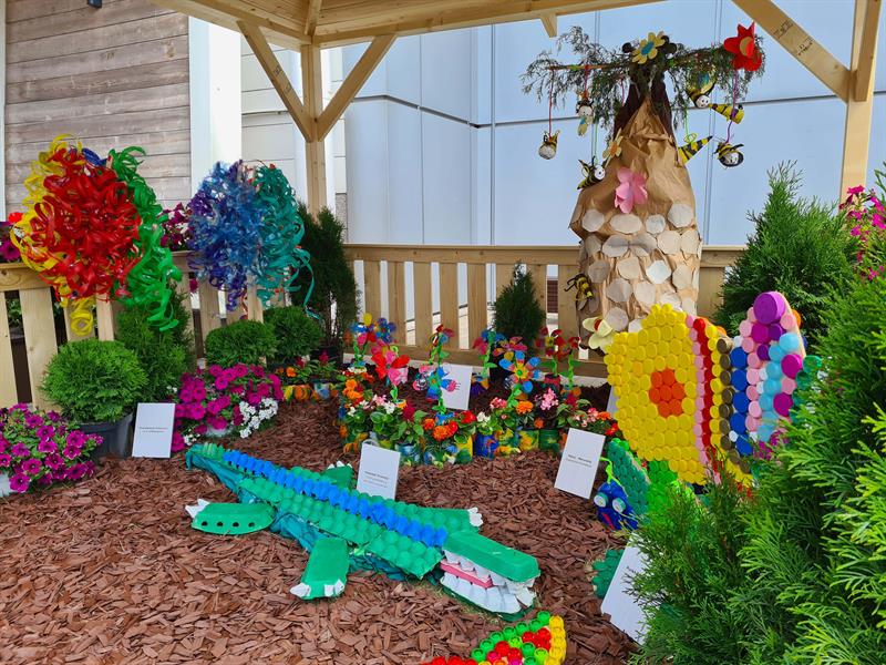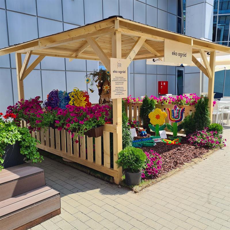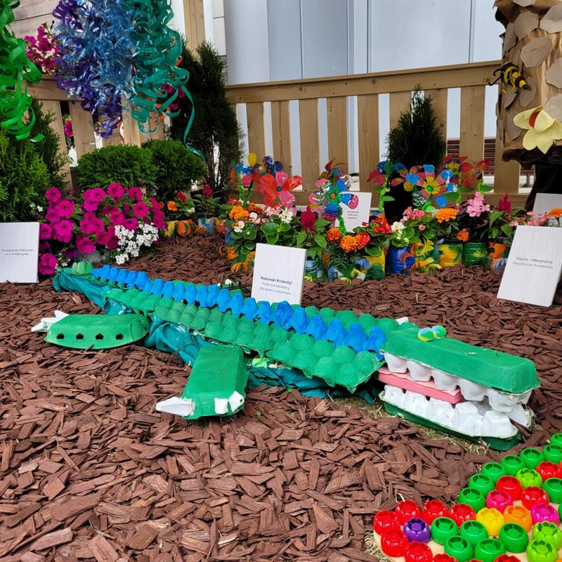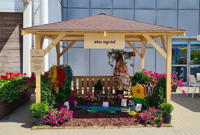 Efekt ich pracy można podziwiać na patio CH Ster, gdzie stanął przepiękny „Eko Ogród”. Znajdziemy tam ul wykonany z makulatury przez dzieci z Akademii Twórczej Edukacji „Pszczółka”, krokodyla stworzonego z wytłoczek do jajek przez najmłodszych z Przedszkola „Niebieski Krokodyl”, czy długą gąsienicę z butelek plastikowych, które przygotowali podopieczni Przedszkola „Hipcio”. W prawdziwym ogrodzie nie mogło zabraknąć także roślin – piękne kwiaty z butelek zrobiły przedszkolaki z „Jagódki”, a do wykonania kwiatowych dekoracji dzieci z Przedszkola Publicznego w Dołujach wykorzystały nakrętki do butelek. Całość dopełniły drzewa, których liście z butelek wykonali najmłodsi z Przedszkola Publicznego w Mierzynie.