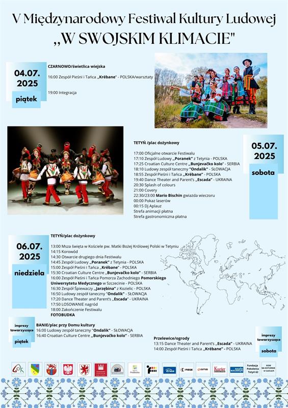 W programie festiwalu: Koncerty i występy zespołów folklorystycznych z Polski i zagranicy, w tym z Ukrainy, Serbii, Słowacji, a także lokalne grupy ZL Poranek i ZŚ Jarzębina oraz z Kaszub i Szczecina, Warsztaty rzemieślnicze i taneczne, dzięki którym uczestnicy będą mogli aktywnie zaangażować się w tworzenie sztuki ludowej, poznając tradycyjne tańce, rękodzieło oraz śpiew; Stoiska z rękodziełem, prezentujące wyroby artystów i twórców lokalnych oraz międzynarodowych; Regionalne potrawy i tradycyjna kuchnia, które przybliżą smak i kulturę kulinarną regionu; Strefy zabaw i warsztatów dla najmłodszych, tworząc przestrzeń dla dzieci do poznawania folkloru poprzez zabawę; Wielki korowód, który podkreśli kolorowy i radosny charakter festiwalu; Gwiazda wieczoru Mario Bischin; Splash of colours; Zabawa z dj.