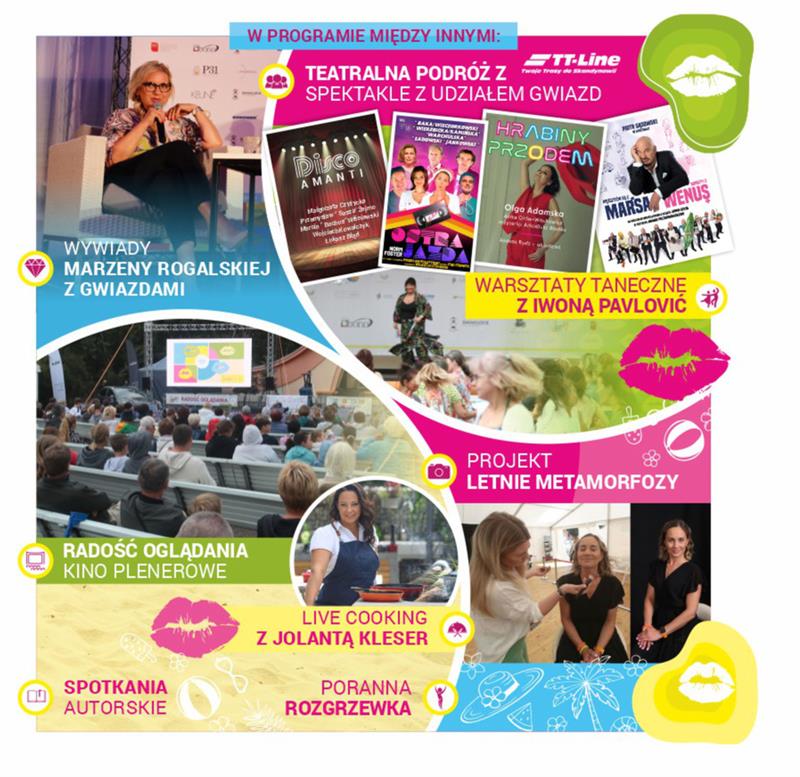 Nie zabraknie kultowej Roztańczonej Promenady – warsztatów tanecznych prowadzonych przez Iwonę Pavlović czy Rozmów na kanapach – cyklu wywiadów z gwiazdami, które prowadzi znana i lubiana Marzena Rogalska. Każdego festiwalowego wieczoru w wielkim namiocie prezentowane będą spektakle teatralne w gwiazdorskiej obsadzie.