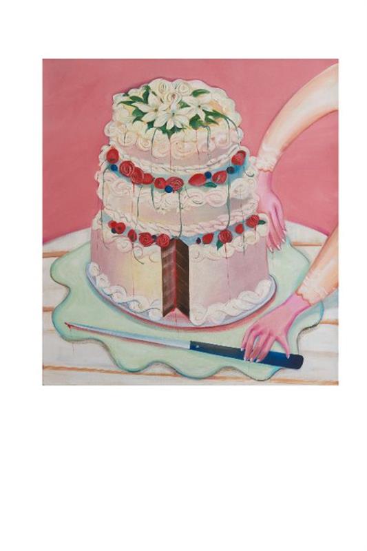 – Pełna wersja tego zwrotu to „być z kimś za pan brat”, czyli „pozostawać z kimś w zażyłych stosunkach”. Aby zapowiedzieć dekonstrukcję tytułowego archaizmu, obrazem promującym wystawę został „Wedding Cake” (2020), prezentujący dłoń panny młodej sięgającą po nóż do tortu. Zarówno na wypieku, jak i na à la sztylecie znajdują się cienkie wiązki krwi. Jest to świat emocji i relacji widziany ze stereotypowej perspektywy ról społecznych – dodaje A. Konopka.