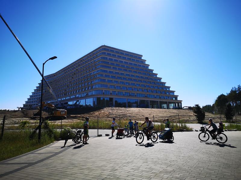 Tam właśnie powstaje największy w Polsce hotel Gołębiewski, który będzie mógł jednorazowo przyjąć ok. 3 tys. gości. Niestety, nie udało się dotrzymać czerwcowego terminu otwarcia, gdyż do wykonania jest jeszcze wiele prac. Gotowych jest ok. 370 pokoi w części zachodniej, ale hotel to jeszcze wielki plac budowy, więc budowlańcy zakłócaliby wypoczynek.
