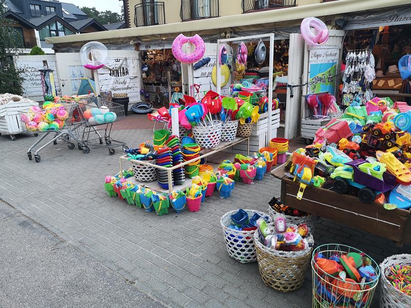 Tak wygląda wiele ulicznych kramów w nadmorskich miejscowościach. Niektórzy właściciele „zostali z towarem”, który trafi do sprzedaży w przyszłym roku. Wiele towaru, jak chociażby plastikowe łopatki czy też kubełki, nie ulegnie zepsuciu, ale nieco gorzej jest z chińskimi nadmuchiwanymi materacami czy też kołami ratunkowymi, które mogą stracić na jakości. No, ale takie jest ryzyko w tej branży: jak jest zimno i deszczowo, to towar nie idzie. Ten rok jednak był udany, gdyż na Wybrzeżu królowało słońce. Może jeszcze we wrześniu przybędą dziadkowie z wnukami i trochę kupią… ©℗