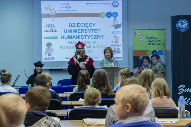 Grupa małych studentów Dziecięcego Uniwersytetu Humanistycznego rozpoczęła w czwartek uroczyście nowy rok akademicki 2019/2020. Jego inauguracja odbyła się w Wyższej Szkole Humanistycznej Towarzystwa Wiedzy Powszechnej w Szczecinie przy ul. Monte Cassino 15. Obecny rok jest dziewiątym w historii DUH, który wykształcił dotąd ponad 800 najmłodszych absolwentów tej uczelni. Tegoroczni studenci będą uczestniczyć w wykładach i ćwiczeniach prowadzone na trzech kierunkach: Kocie sprawy, psie zabawy; Klockomania; Eksperymenty i wynalazki.