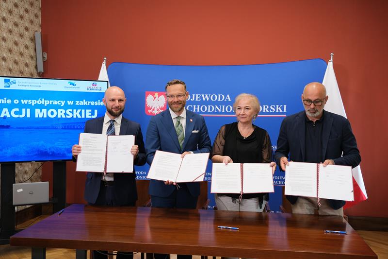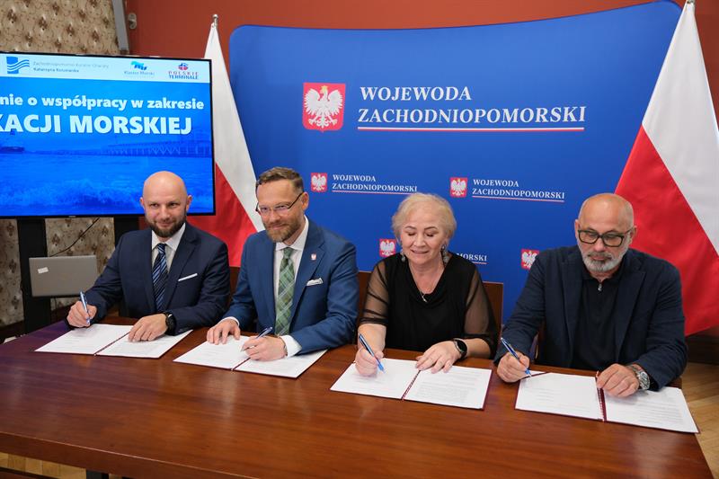 Wojewoda zachodniopomorski Zbigniew Bogucki, zachodniopomorski kurator oświaty Katarzyna Koszewska, przewodniczący Rady Klastra Morskiego Pomorza Zachodniego Dariusz Śpiewak i prezes Polskich Terminali Dariusz Smoliński podpisali w poniedziałek (21 sierpnia) porozumienie. Dotyczy ono działań na rzecz edukacji morskiej i ekologicznej oraz popularyzacji branży morskiej. Celem jest upowszechnianie wiedzy na temat ekosystemów morskich, zrównoważonego wykorzystania zasobów oraz możliwości rozwoju zawodowego w sektorze morskim.