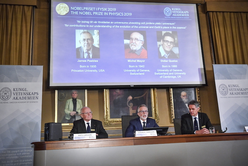 Kanadyjczyka Jamesa Peeblesa doceniono "za odkrycia teoretyczne w dziedzinie fizycznej kosmologii", a dwóch badaczy ze Szwajcarii, Micheala Mayora i Didiera Queloza "za odkrycie egzoplanety okrążającej gwiazdę podobną do Słońca”.