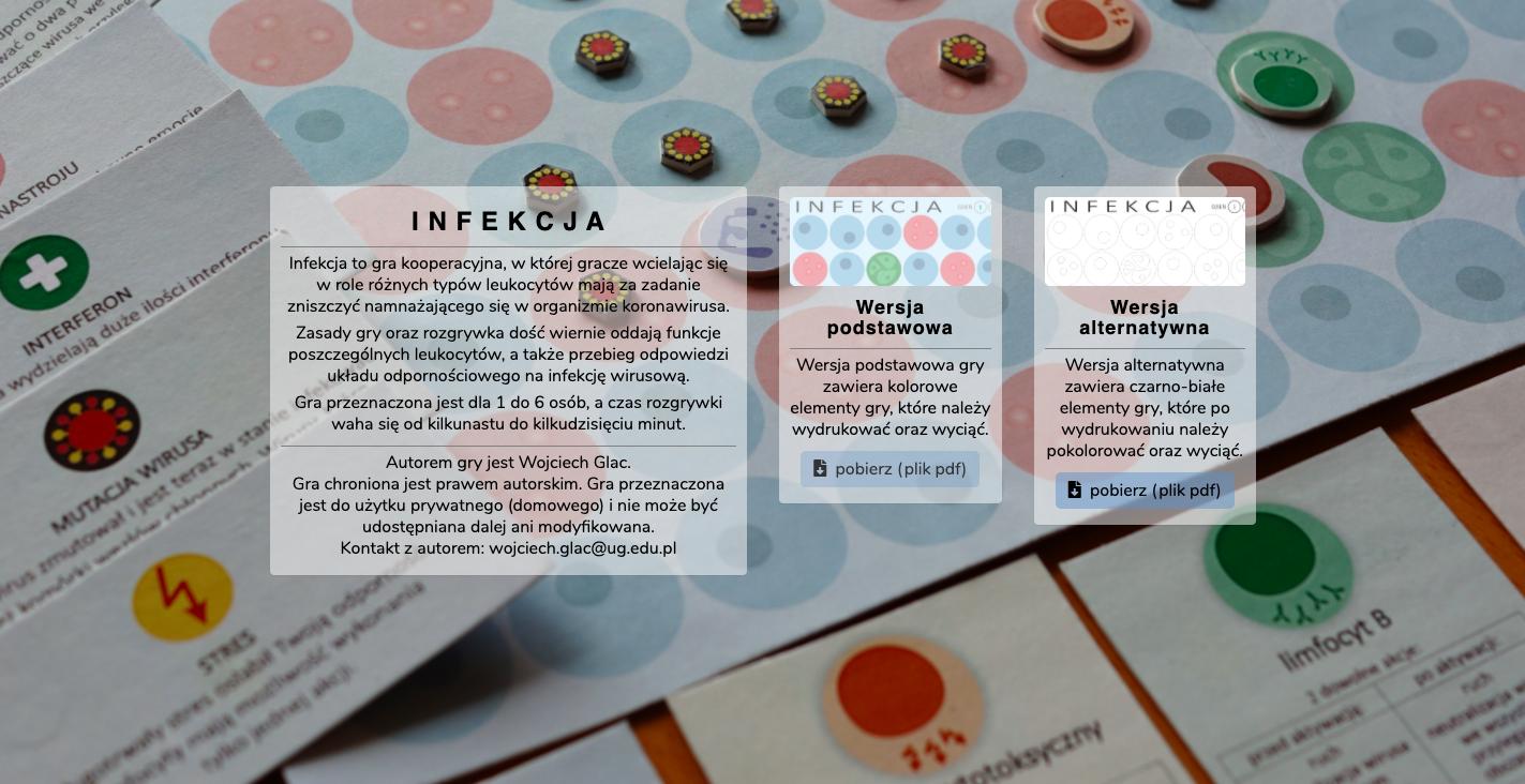 "Infekcja" – to nazwa gry planszowej, którą stworzył i udostępnił w internecie dr Wojciech Glac – neurobiolog z Uniwersytetu Gdańskiego. Zabawa pomaga zrozumieć procesy, jakie zachodzą w ludzkim organizmie po zakażeniu go koronawirusem.