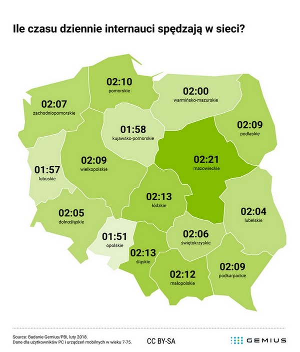 W lutym br. internauci w Polsce spędzili w sieci średnio 2 godz. i 6 min (źródło: badanie Gemius/PBI, luty 2018 roku). Najwięcej czasu na przeglądanie internetu poświęcili mieszkańcy Mazowsza. Średni czas surfowania przypadający na jednego mieszkańca województwa mazowieckiego wyniósł 2 godz. 21 min dziennie. Na drugim miejscu uplasowały się województwa łódzkie i śląskie, gdzie średni dzienny czas spędzony przez użytkownika w sieci był równy 2 godz. i 13 min. W zachodniopomorskim - 2 godz. i 7 min. Tylko w trzech województwach mieszkańcy spędzili w internecie mniej niż dwie godzinny dziennie. Najkrócej po sieci surfowali mieszkańcy województwa kujawsko-pomorskiego (1 godz. 58 min), lubuskiego (1 godz. 57 min) i opolskiego (1 godz. 52 min).