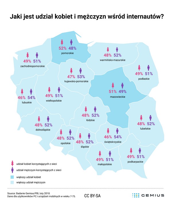 W przeważającej części województw większy odsetek internautów stanowili mężczyźni. Tylko w dwóch udział kobiet wśród korzystających z sieci przekroczył 50 proc. Najbardziej „kobiecymi” województwami było pomorskie (52 proc.) oraz mazowieckie (51 proc.). Z kolei największy odsetek panów surfujących po sieci odnotowano w świętokrzyskim i lubuskim (54 proc. mężczyzn i 46 proc. kobiet). Również w tych województwach różnica między udziałem kobiet i mężczyzn korzystających z internetu była największa. W Zachodniopomorskiem panów było 51 proc., a pań 49 proc.