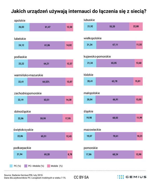 Gemius sprawdził, za pomocą jakich urządzeń internauci łączyli się z siecią w lutym tego roku. We wszystkich województwach większość osób korzystała z internetu zarówno przy użyciu komputerów, jak i urządzeń mobilnych. W mazowieckim odsetek ten wynosił aż 70 proc., a w lubuskim tylko 55 proc. Odsetek osób łączących się z internetem wyłącznie za pomocą smartfonów i tabletów był najwyższy w lubuskim. W pozostałych odsetek internautów wyłącznie mobilnych nie przekroczył 20 proc. (w Zachodniopomorskim 14,3 proc.). W województwie opolskim z kolei odnotowano najwyższy udział osób, które łączyły się z siecią tylko za pomocą komputerów osobistych i laptopów (ponad 26 proc.), a najniższy odsetek, niespełna 18 proc., był w pomorskim.