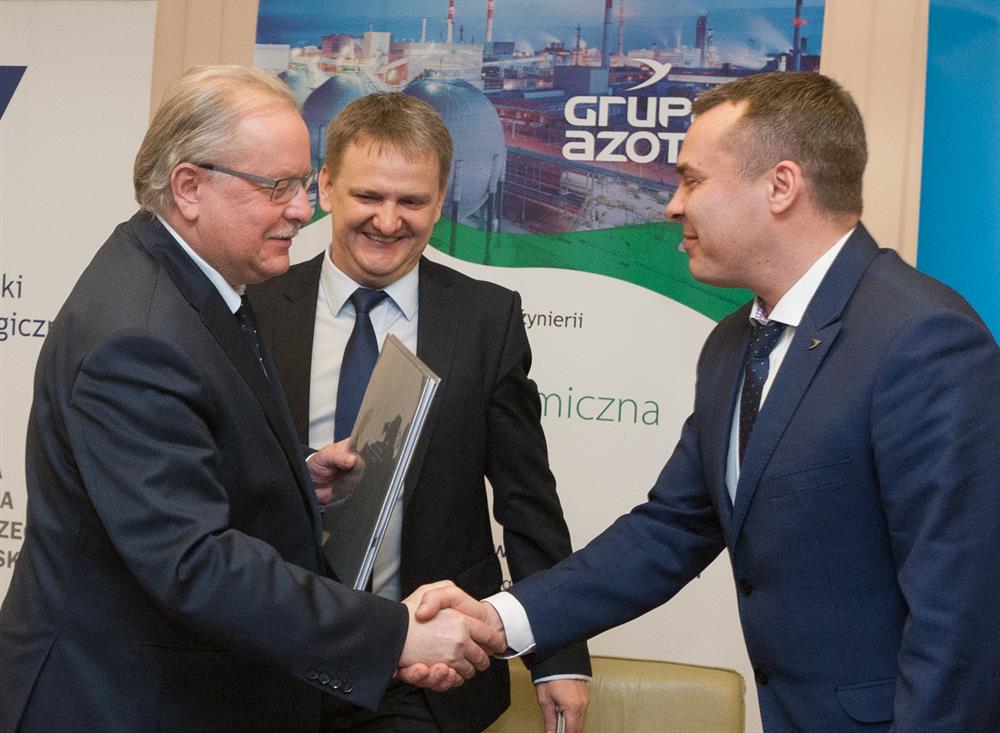 Na zdjęciu: prof. Włodzimierz Kiernożycki (z lewej) współpracuje z przedstawicielami Grupy Azoty - dr Wojciechem Naruciem oraz Rafałem Kuźmiczonkiem.